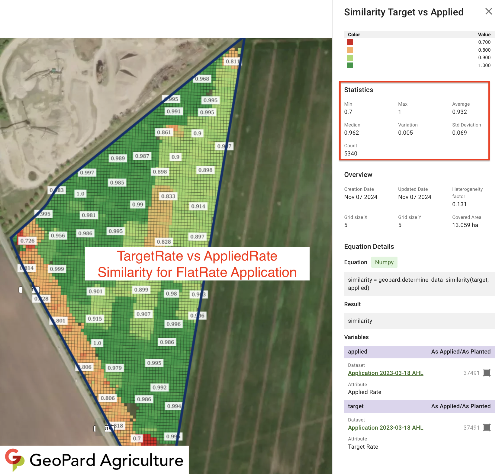 To assess the accuracy of the fertilizer application, we will utilize a pre-saved Equation named <mark style="background-color:yellow;">Spatial Correlation Analysis (Data Layers Similarity)</mark> that measures the similarity between Applied Rate and Target Rate values on a spatial basis.&#x20;