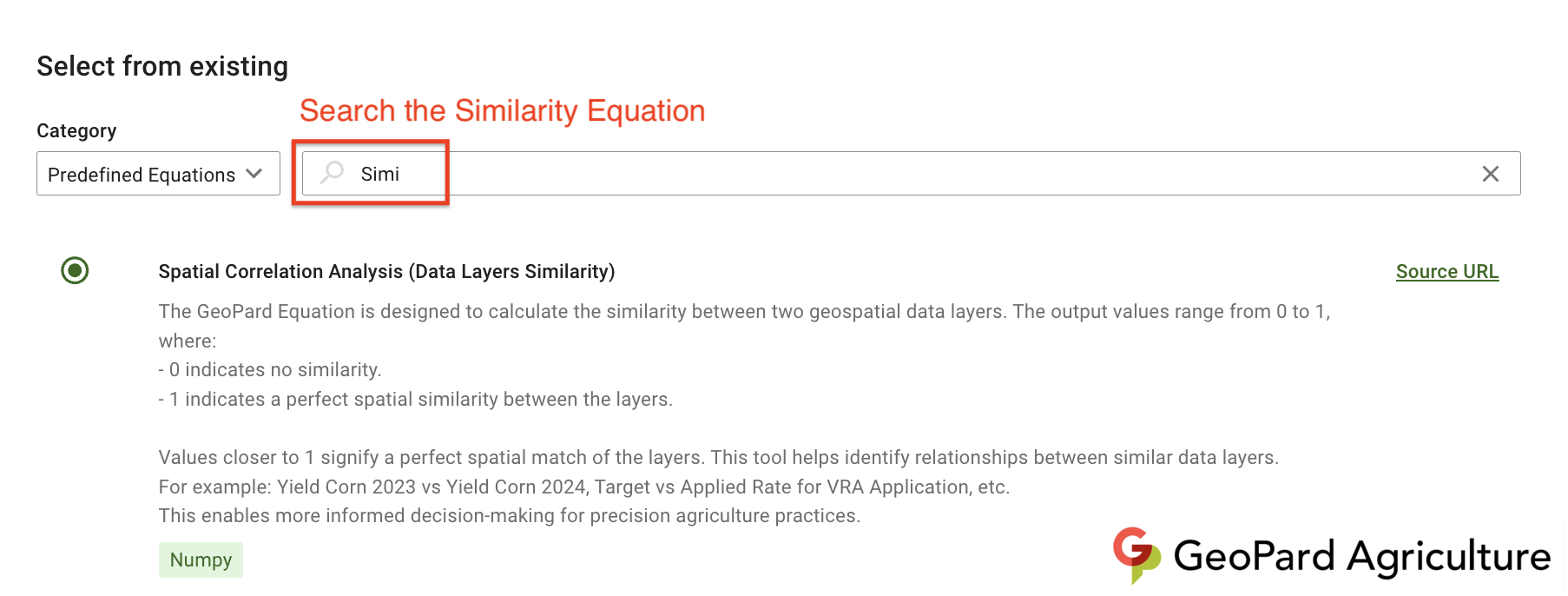 <figure><img src="https://3272281156-files.gitbook.io/~/files/v0/b/gitbook-x-prod.appspot.com/o/spaces%2FYICBELdyAXXebKAzfLOR%2Fuploads%2FrDgSf0J2uDfD9Wy0GPjw%2Fimage.png?alt=media&#x26;token=7af48fc7-2044-483c-b50b-a1ea3c0461f7" alt=""><figcaption><p>Search the existing Data Layers Similarity Equation</p></figcaption></figure>