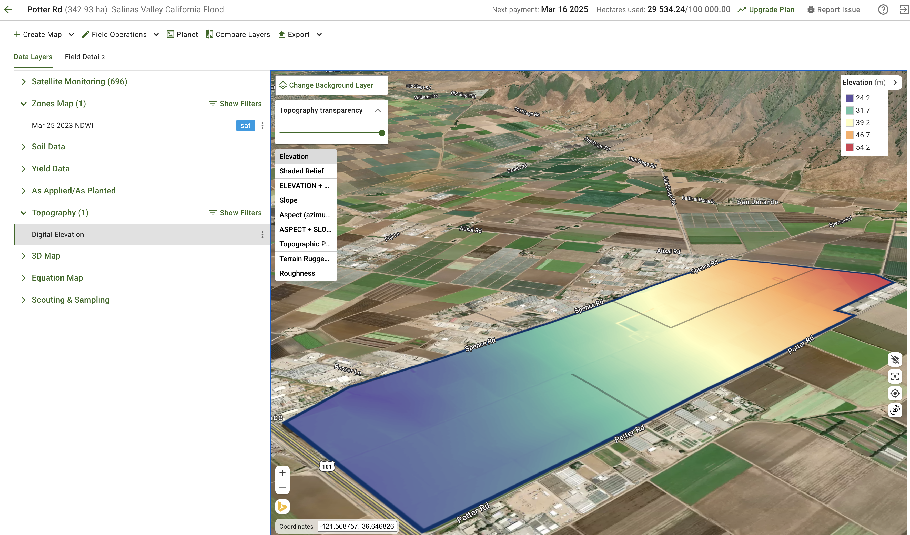 3. Select the specific field or area you want to analyze. For this example, choose the **"Potter Rd (342.93 ha)"** field in Salinas Valley.
