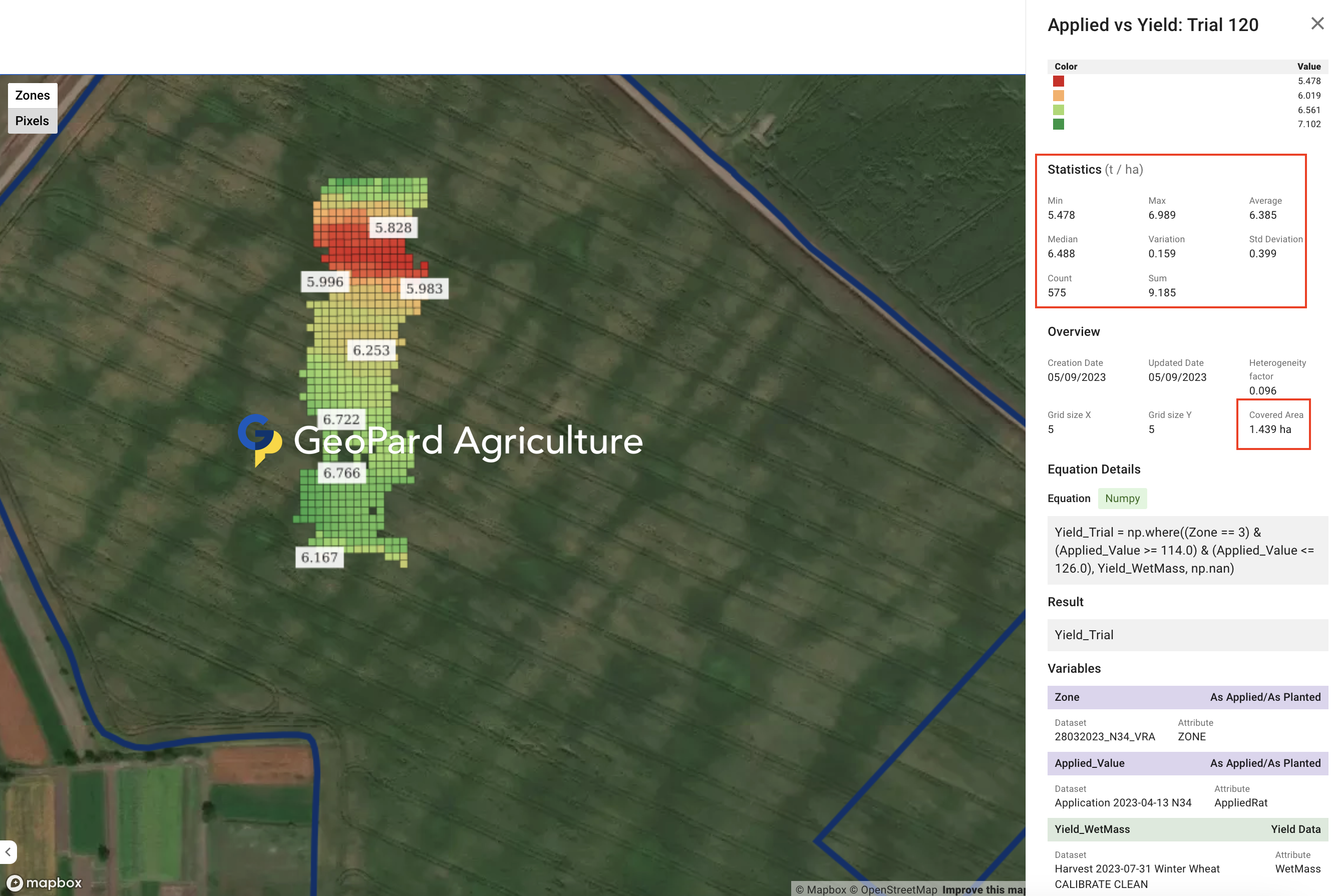 Zones/Plots with Trials/Experiments: These show the planned Application rates for our Trials, giving insight into the experimental design. If such a data layer is available, we upload it as shapefile into the AsApplied/AsPlanted or Yield control. This ensures compatibility when building EquationMaps, streamlining your trial analytics experience. If such a data layer isn't available, the TargetRate attribute from the Application Dataset can serve as a substitute for Trial evaluations.