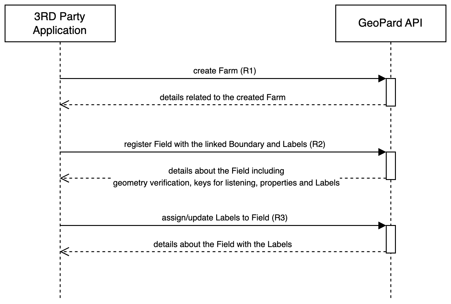 Following the creation of the Farm entity, the second step entails registering the Field ([Request 2 or R2](https://docs.geopard.tech/geopard-tutorials/api-docs/requests-overview/14.-mutation-create-a-field-or-edit-the-boundary-of-the-existing-field-with-optional-labels)). During this step, compulsory parameters such as the UUID linked to the Farm and the Field boundary are provided. Labels, while optional during the registration process, can be assigned as well.