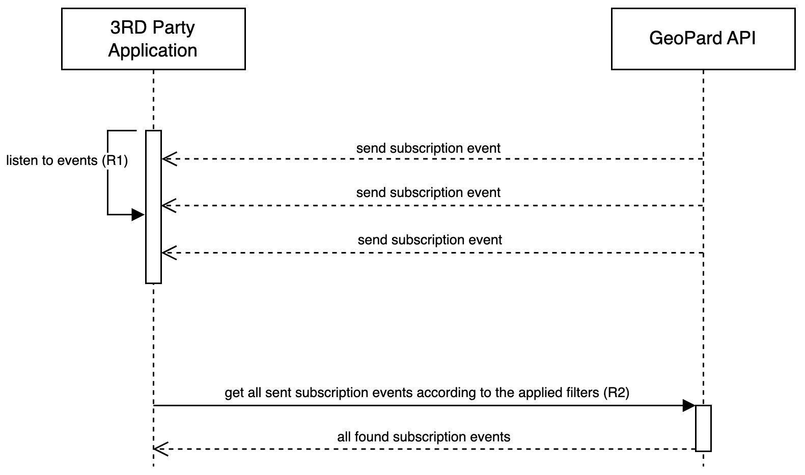 Moreover, should there be any missed or lost events, users have the capability to retrieve them. This is achieved by executing a GraphQL query tailored for a specific date range and entities (User, Farm, Field), effectively enabling a complete recovery of past events ([Request 2 or R2](https://docs.geopard.tech/geopard-tutorials/api-docs/requests-overview/82.-query-restore-subscription-events)). This level of functionality ensures no information is lost, maintaining the integrity and consistency of user data.