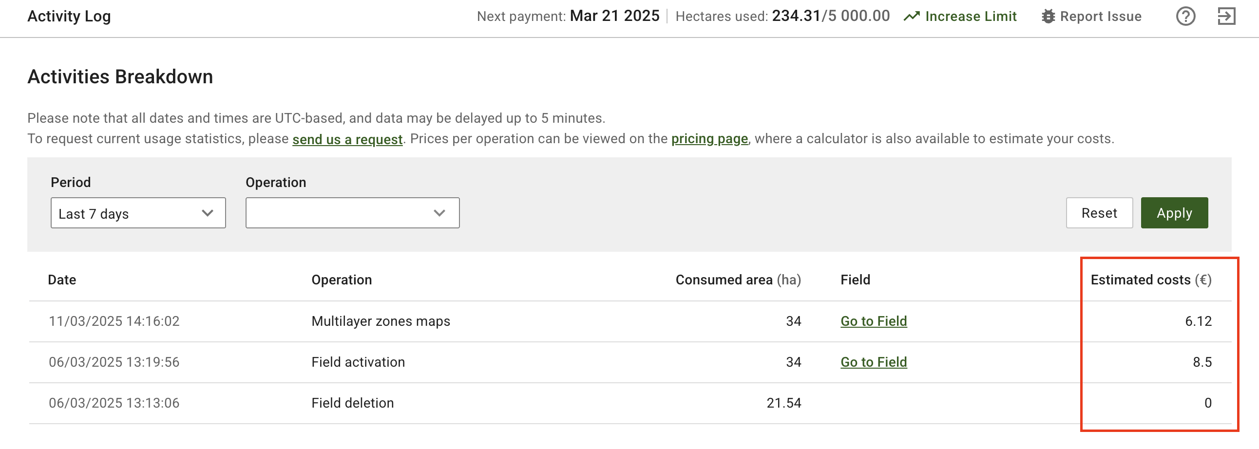<figure><img src="https://3272281156-files.gitbook.io/~/files/v0/b/gitbook-x-prod.appspot.com/o/spaces%2FYICBELdyAXXebKAzfLOR%2Fuploads%2F1cwOKWbdQIGMe7lcVE2G%2FScreenshot%202025-03-11%20at%2014.21.05.png?alt=media&#x26;token=677afb9d-6b04-440f-93a7-35c70a19659d" alt=""><figcaption><p>Estimated Costs in Activity Log</p></figcaption></figure>