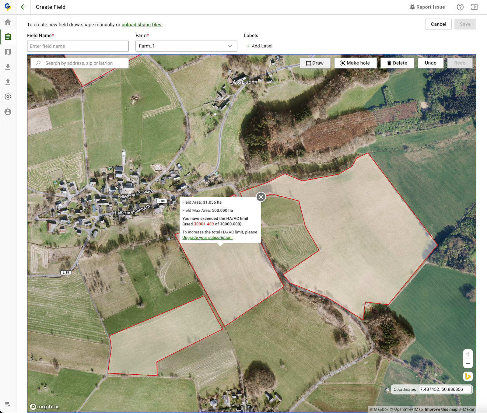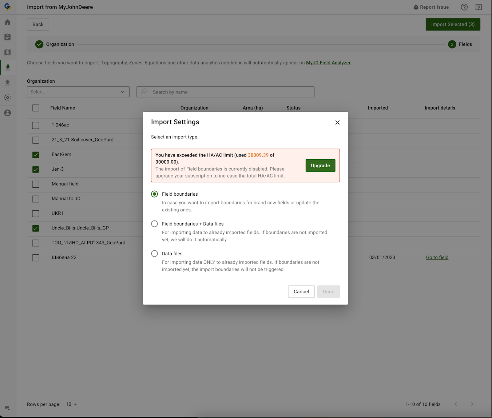 The GeoPard team has implemented significant enhancements to streamline the field creation and import procedures, focusing on keeping users informed about their account limits. Now, the system proactively checks if the total field area exceeds the account's hectare/acre limit during the import from John Deere or the usual file upload process. GeoPard users will receive notifications if a potential import is likely to surpass these limits. If you're approaching your account's hectare/acre capacity, we'll recommend considering a larger subscription plan that accommodates a greater area. This update aims to provide a clearer understanding and better management of your account's capacity, enhancing your overall experience.