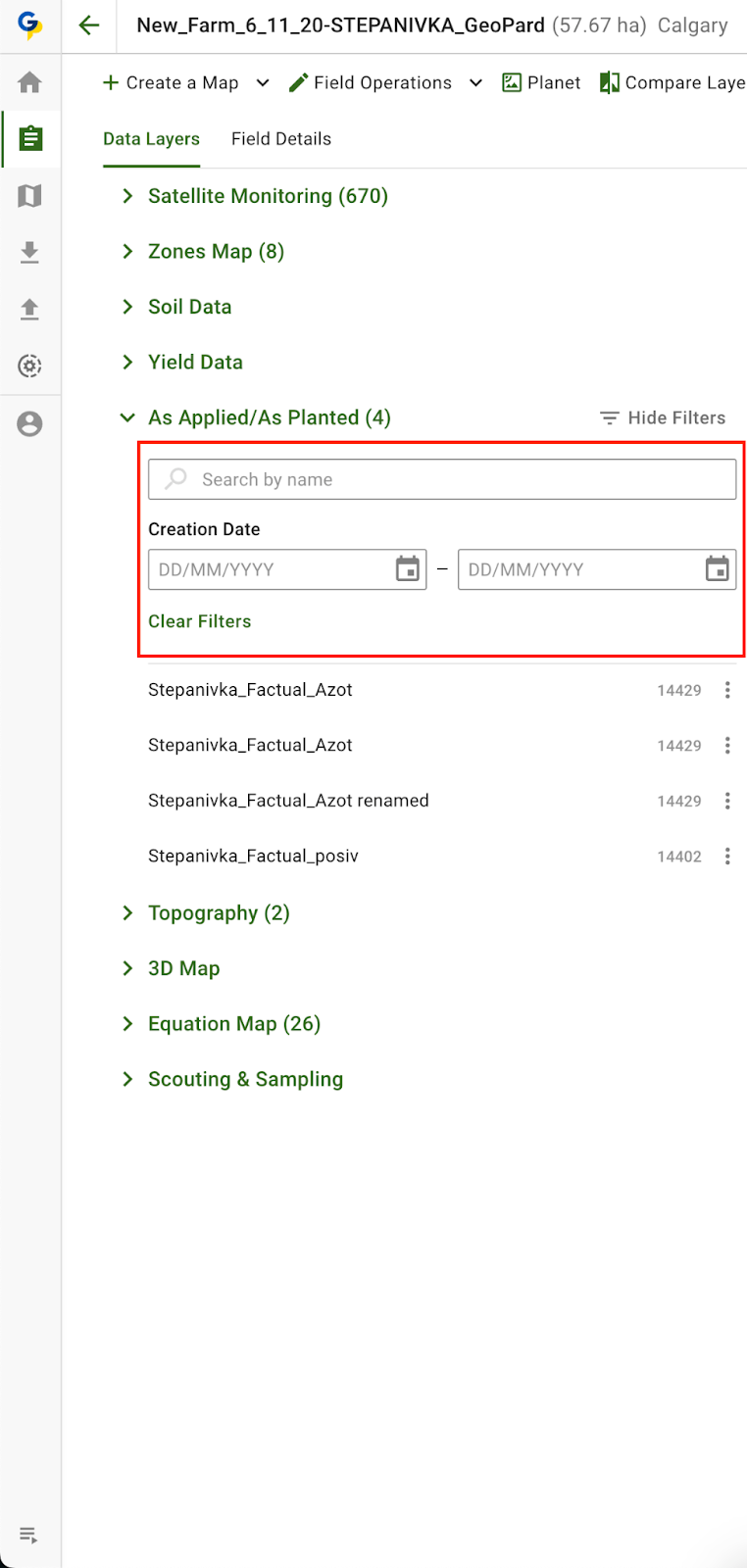 The GeoPard team is pleased to roll out improved filtering capabilities for asset groups within the field's data layers tree. GeoPard users can now effortlessly filter Soil Data, Yield Data, As Applied/As Planted, Topography, and 3D Map groups using two convenient controls: Search by Name and Search by Creation Date. This update establishes consistency in our interface by aligning with the filtering functionality already present in other groups like Equation Maps, Vector Analysis Maps, and Satellite Images. It aims to significantly improve the user experience when managing and navigating through different data layers.
