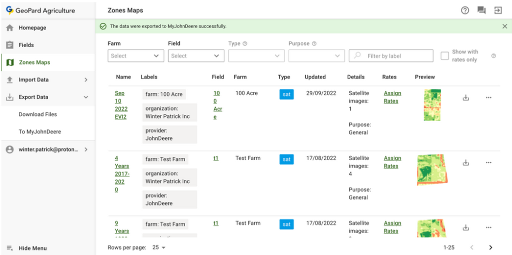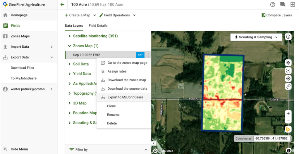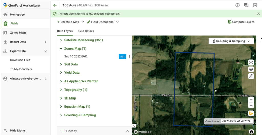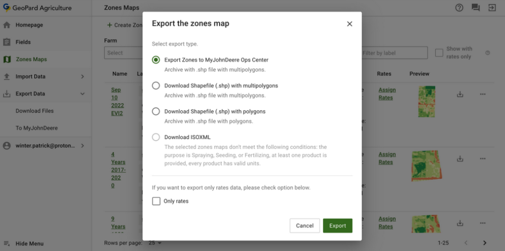 4.8 Customers of GeoPard have an opportunity to export Zones Maps(Rx VRA prescriptions) and Equation Maps to John Deere Operations Center from the Field tab.