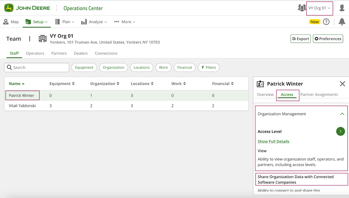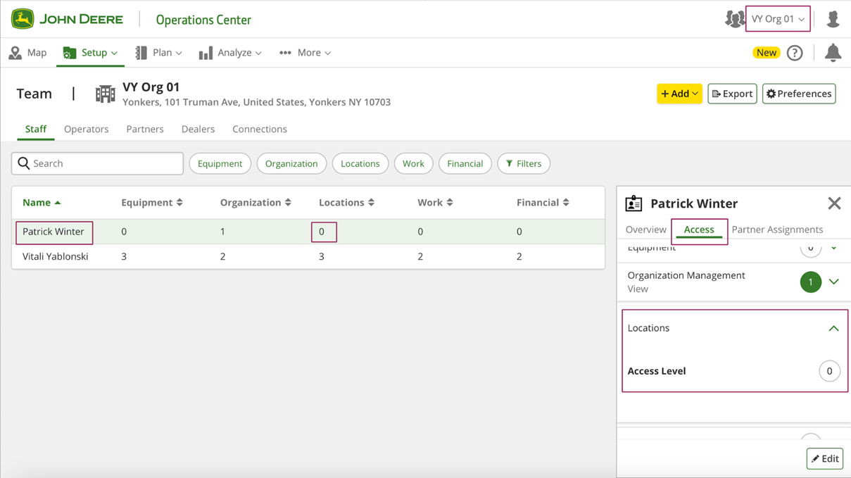 2. The staff member should go to the "Setup" >> "Team" page (or <https://team.deere.com/>) and check the "Access" tab.<br>