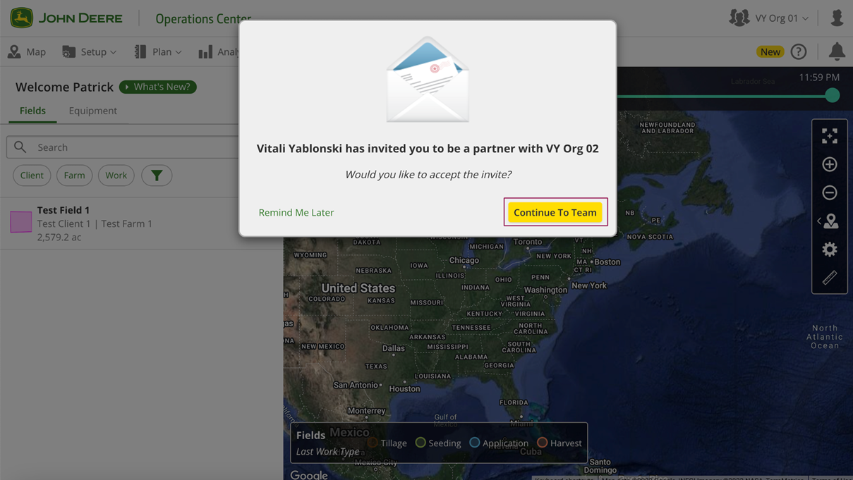 After that partner account receives an email notification about it and the confirmation popup for the first login to the John Deere Ops Center. The partner should click the "Continue To Team" button.