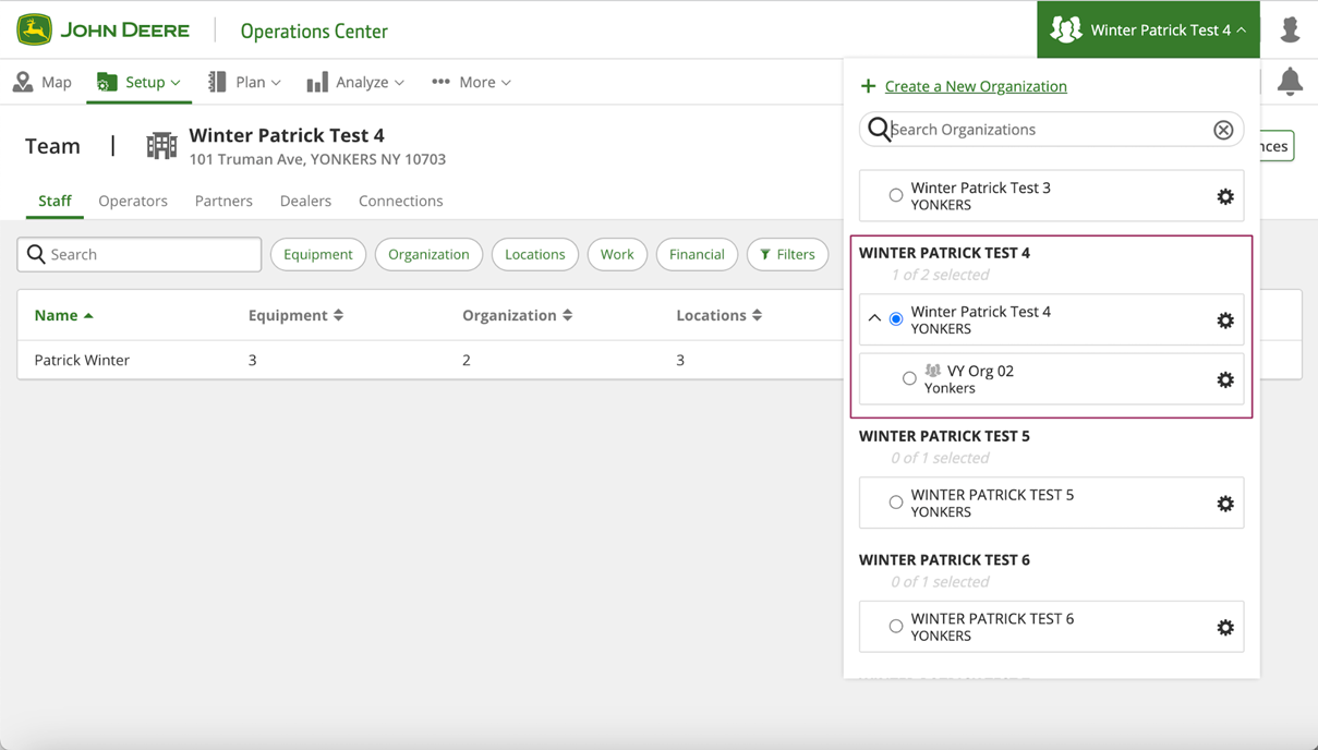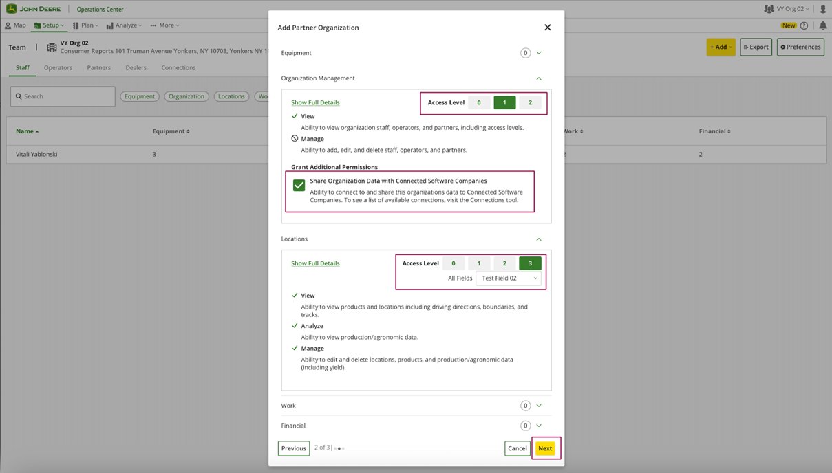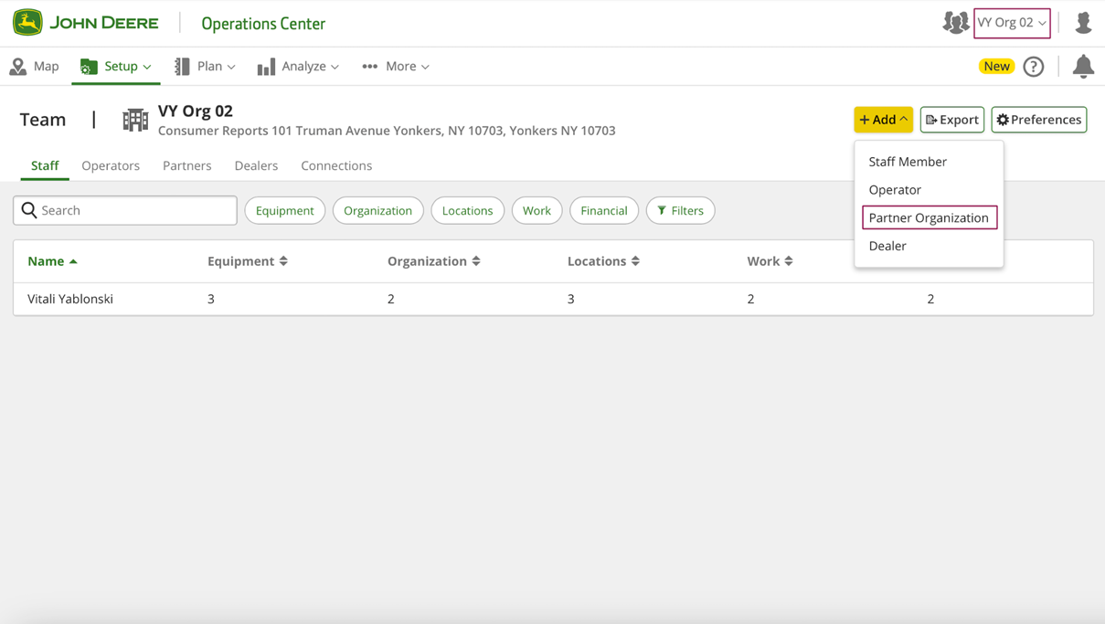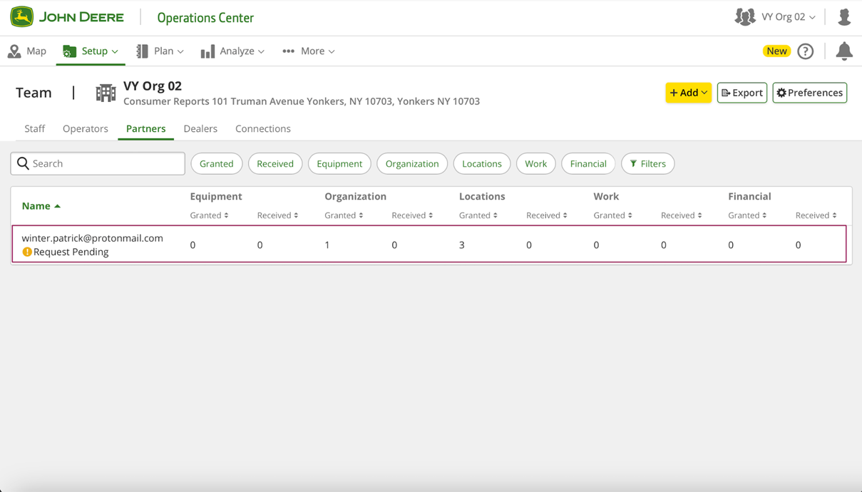 To share data of the organization with the partner organization, the owner of the organization should go to the "Setup" >> "Team" page (or https://team.deere.com/), select the organization (example VY Org 02) and click the "Partner Organization" button.