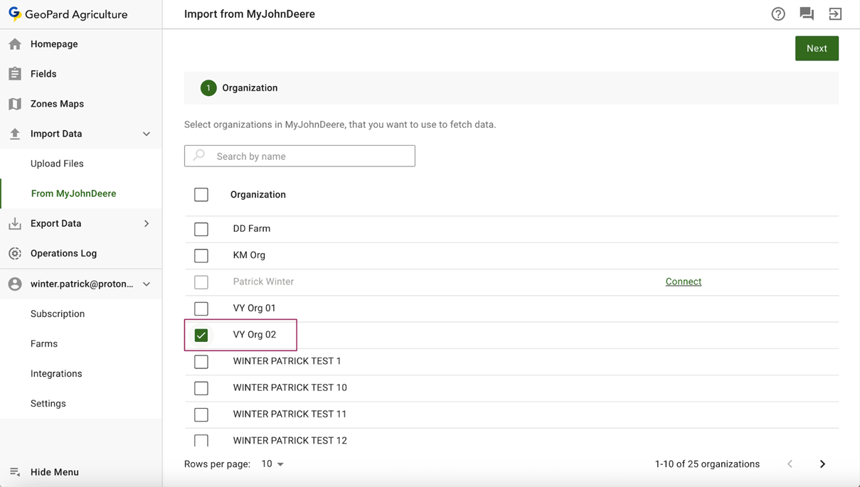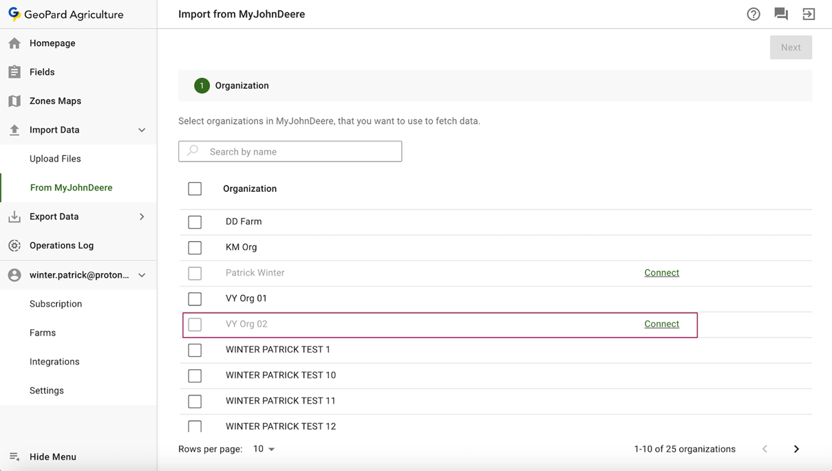 The GeoPard app should display the new organization, then the partner should click the "Connect" link (for example VY Org 02).